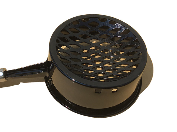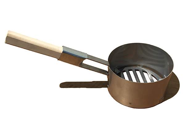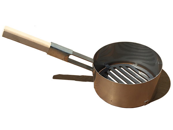 炭の火起こしに使う手持ち鍋型の火起こし器です。備長炭やオガ炭を立てて入れて、ガスコンロの火にかけて使います。短時間で効率よく火を起こすことができます。持ち手を長く作ってありますので、手が熱くなりにくいようになっています。炭火を使うお店には必需品です。